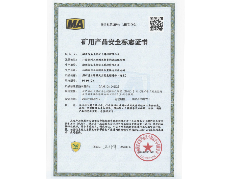 煤矿堵水用聚氨酯材料安标证