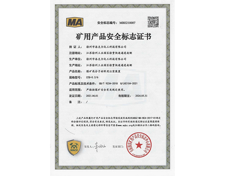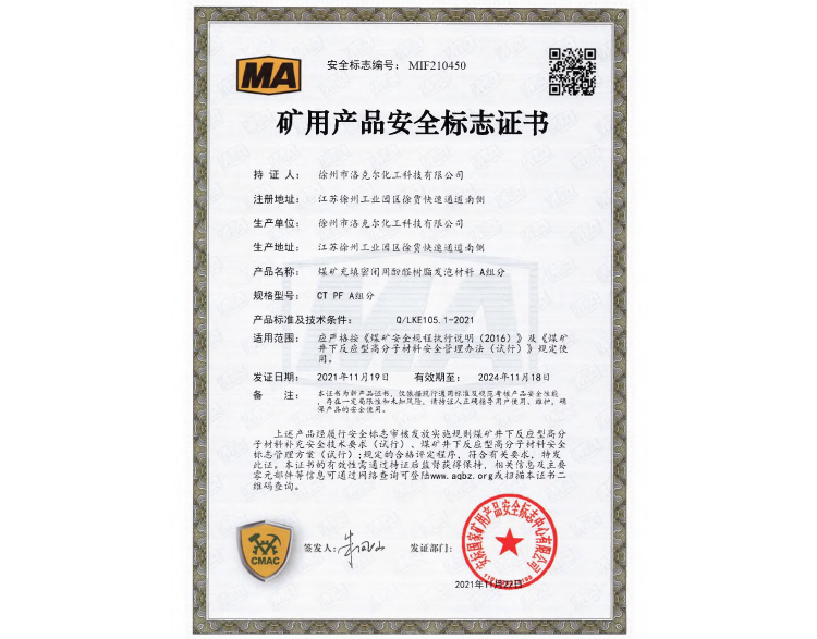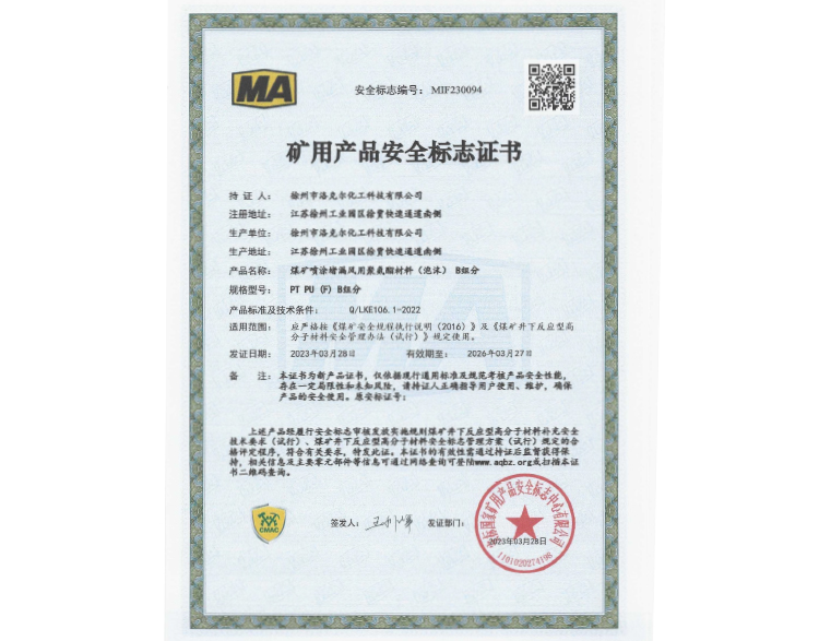 煤矿加固煤岩体用聚氨酯材料安标证书